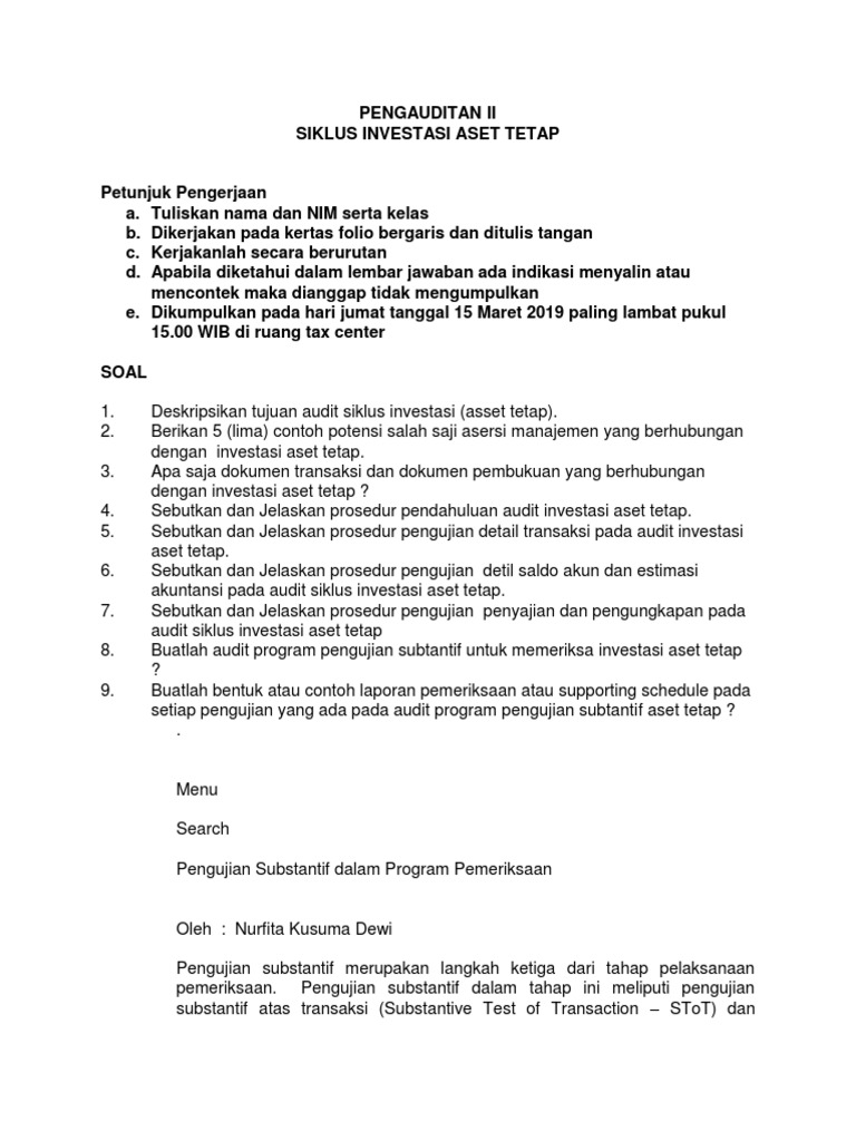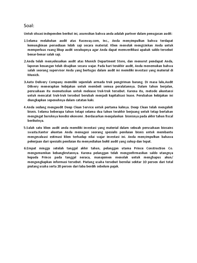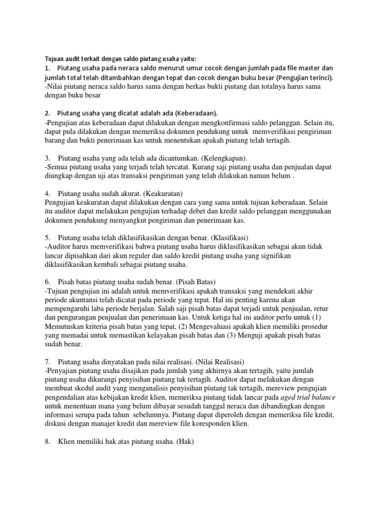 Soal Dan Jawaban Audit Docx Document from static.fdokumen.com 20.000.000 dan syarat pembayarannya 2/10, n/30. Tujuan pemeriksaan piutang dagang dan piutang lainnya adalah memastikan apakah perusahaan memiliki penjualan kredit yang diotoritasi dan kemungkinan tertagihnya. Akuntansi piutang moh amin jurusan akuntansi fakultas ekonomi. Contoh studi kasus tentang bukti audit dan pengujian. Lihat juga contoh kasus audit piutang dan penyelesaiannya artikel akuntansi lainnya: Piutang non usaha adalah piutang yg timbul dari transaksi selain penjualan barang dan jasa kepada pihak luar seperti piutang kepada karyawa. Contoh kasus audit piutang usaha : Contoh kasus audit piutang usaha dan piutang lainnya terjadi pada pt masraffi yang mempunyai saldo cadangan kerugian piutang sebesar rp 7.000.000 dan piutang dagang sebesar rp 86.400.000 dimana berdasarkan rups hutang diatas 90 hari akan dihapuskan.
